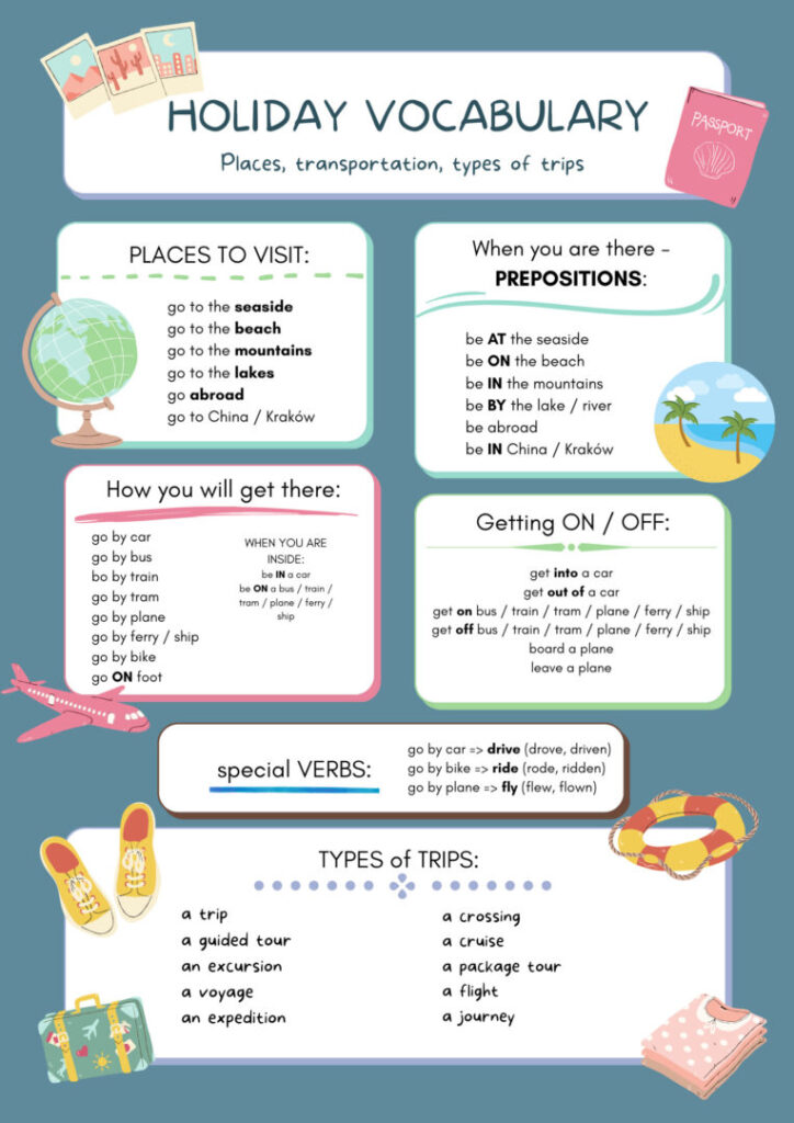 Jesteśmy w pełni sezonu letniego, z całą pewnością część naszych Słuchaczy już wróciła z urlopu, część zaś jest jeszcze przed. Z myślą o nas wszystkich przygotowaliśmy małą serię wpisów wakacyjnych, czyli jak wyjechać za granicę i się dogadać. W blogu mamy słownictwo wraz z tłumaczeniem, poniżej ściąga graficzna czyli wszystkie słówka w jednym miejscu.