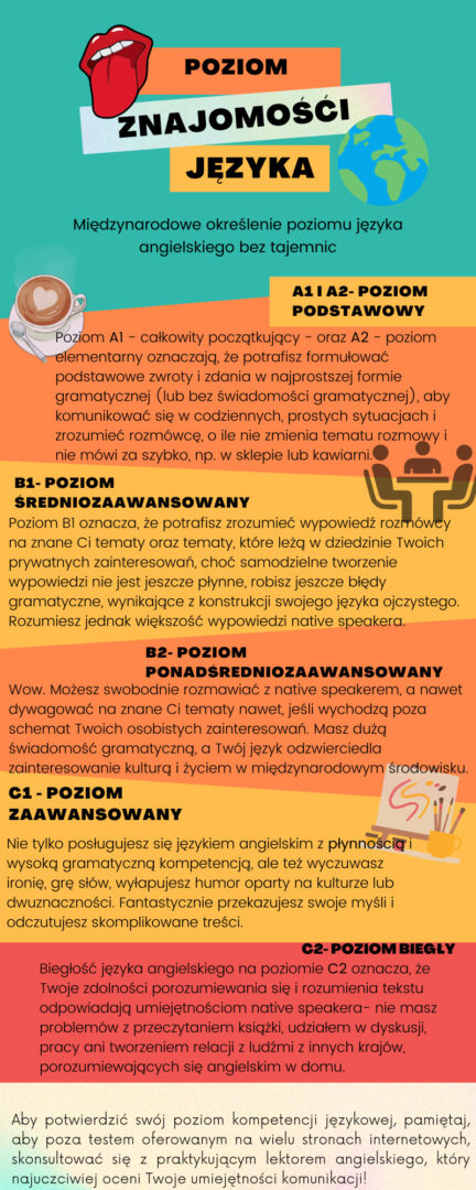 Użycie języka angielskiego w rozmowie z drugą osobą to prawdziwy test naszych LANGUAGE SKILLS, i czasem słyszymy, że uczący się stresują się i obawiają takiej rozmowy. Pamiętajmy, że określenie poziomu kompetencji to nie wyścig z nagrodami, aby komuś zaimponować, a uczciwa ocena faktycznych umiejętności! Nie należy wstydzić się braków, ani obawiać się 'przemądrzania’. Jak najbardziej wiarygodnie i bez naciągania zaprezentujmy swoją wiedzę, a praktykujący lektor będzie w stanie szybko ustalić mocne strony dzięki rozmowie „udającej” przyjacielską pogawędkę lub naśladującej wywiad w sprawie pracy.