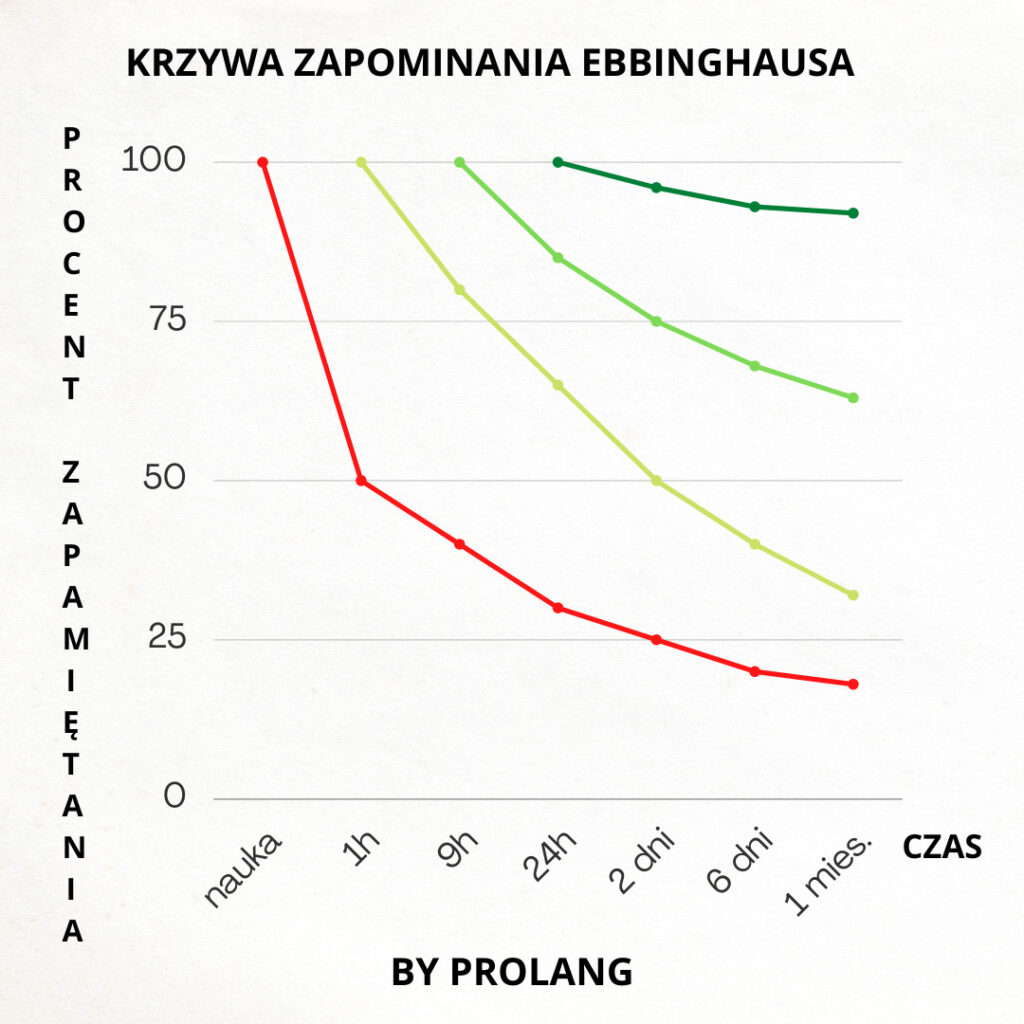 Dlatego pierwszą powtórkę materiału powinniśmy przeprowadzić właśnie 10-15 minut po zakończeniu nauki. Nie będziemy wtedy pamiętać wszystkiego, ale damy sobie szansę na wypełnienie luk i uzupełnienie wiedzy „na świeżo”, jednocześnie nasza „krzywa” odbije z powrotem do góry! Kolejne powtórki powinny, według Ebbinghausa, zostać przeprowadzone kolejno na drugi dzień, po tygodniu i po miesiącu.